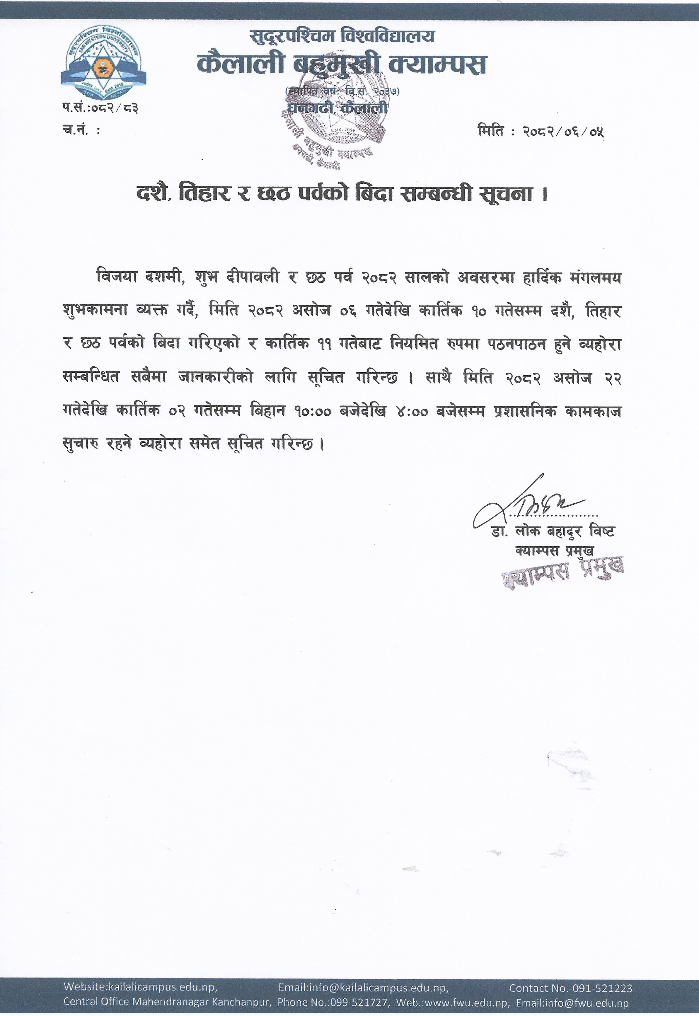 दशै, तिहार र छठ पर्वको बिदा सम्बन्धी सूचना ।