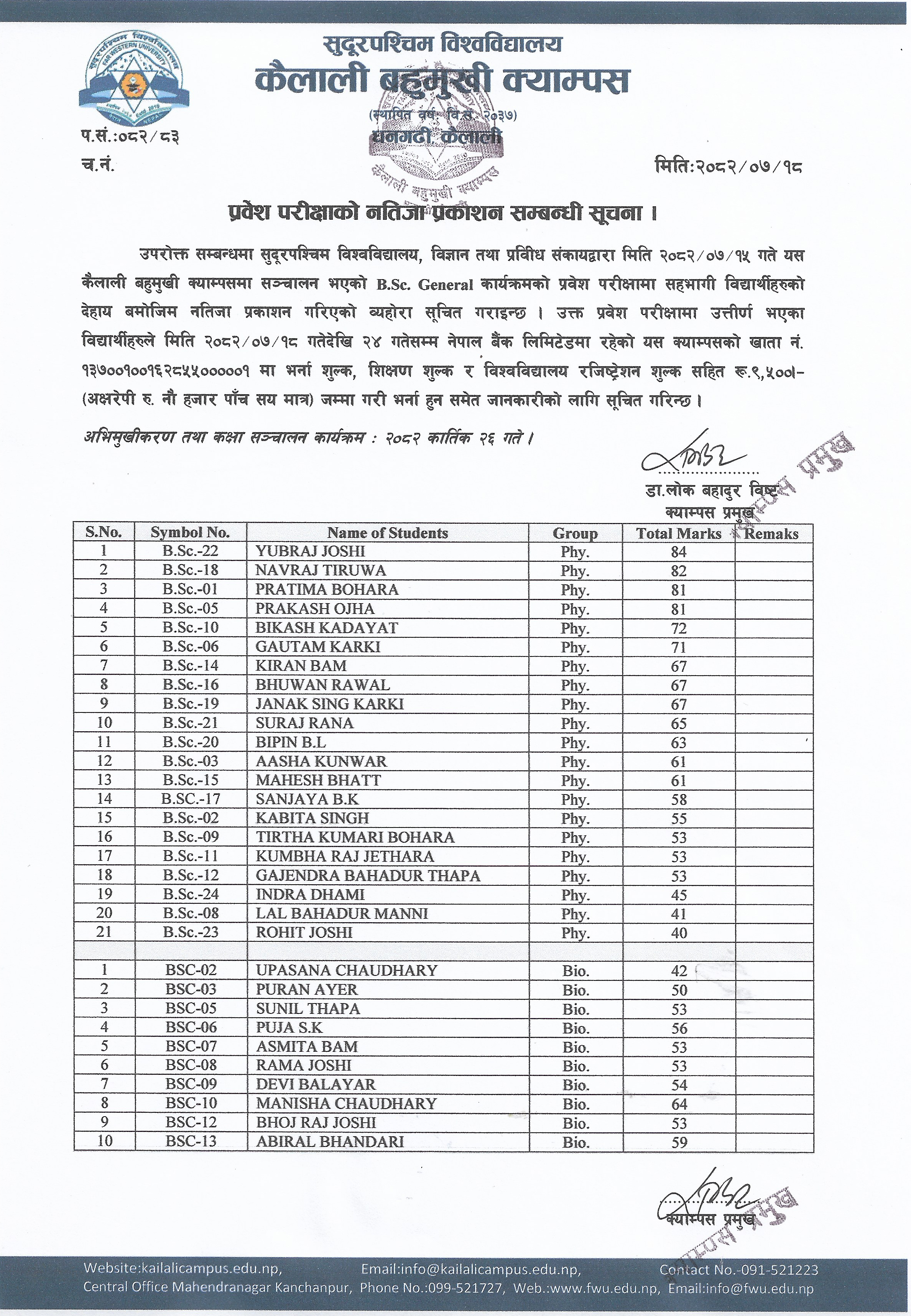B.Sc. General कार्यक्रमको प्रवेश परीक्षाको नतिजा प्रकाशन सम्बन्धी सूचना ।
