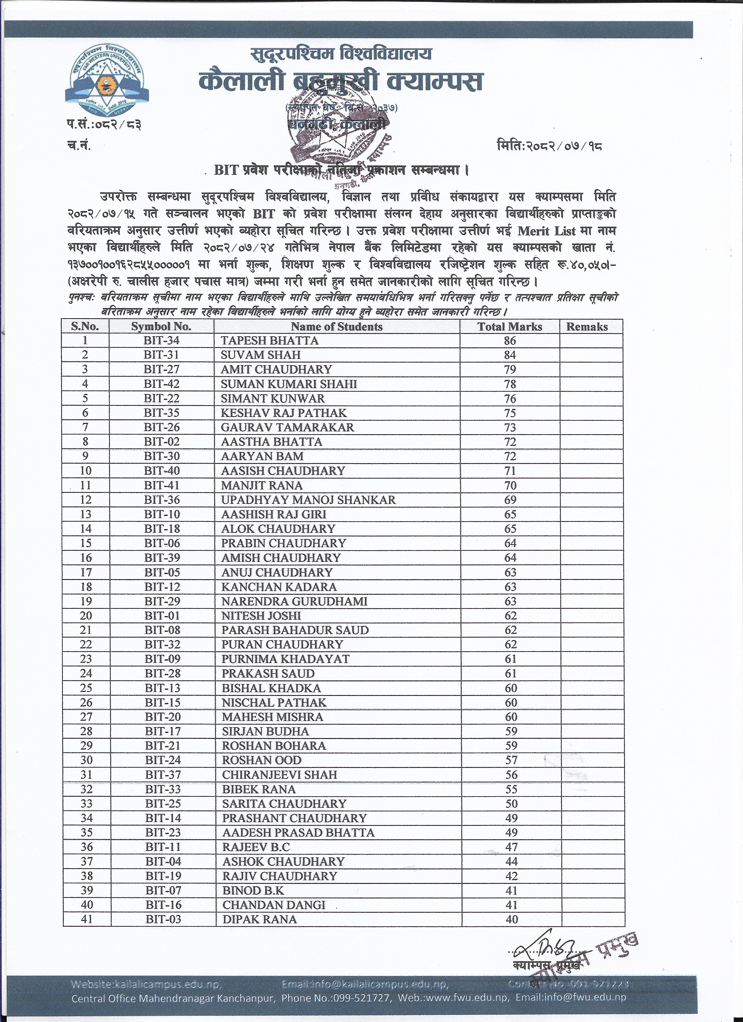 BIT कार्यक्रमको प्रवेश परीक्षाको नतिजा प्रकाशन सम्बन्धी सूचना ।